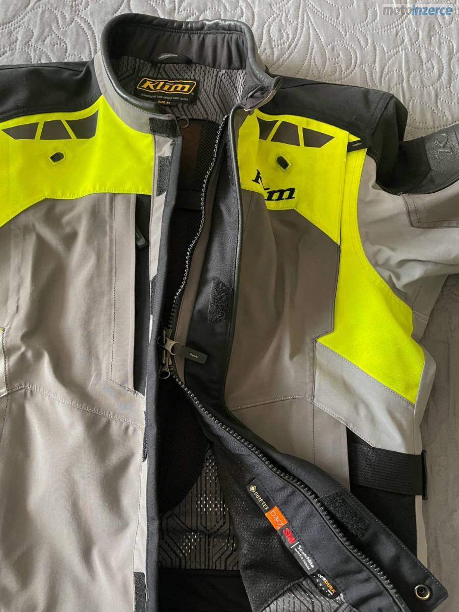 Prodám špičkovou výbavu, stav nových věcí (jeté 14 dní). Věci nebyly NIKDY PRANÉ, membrány 100%. Bunda: KLIM Latitude Europe (Hi-Vis) Vel. 27 (zkrácená pánská 54). Perfektní i pro motorkářky, co potřebují prostor přes hrudník. Integrovaná Gore-Tex membrána (přímo laminovaná – bunda netěžkne vodou), špičkové větrání, D3O chrániče.