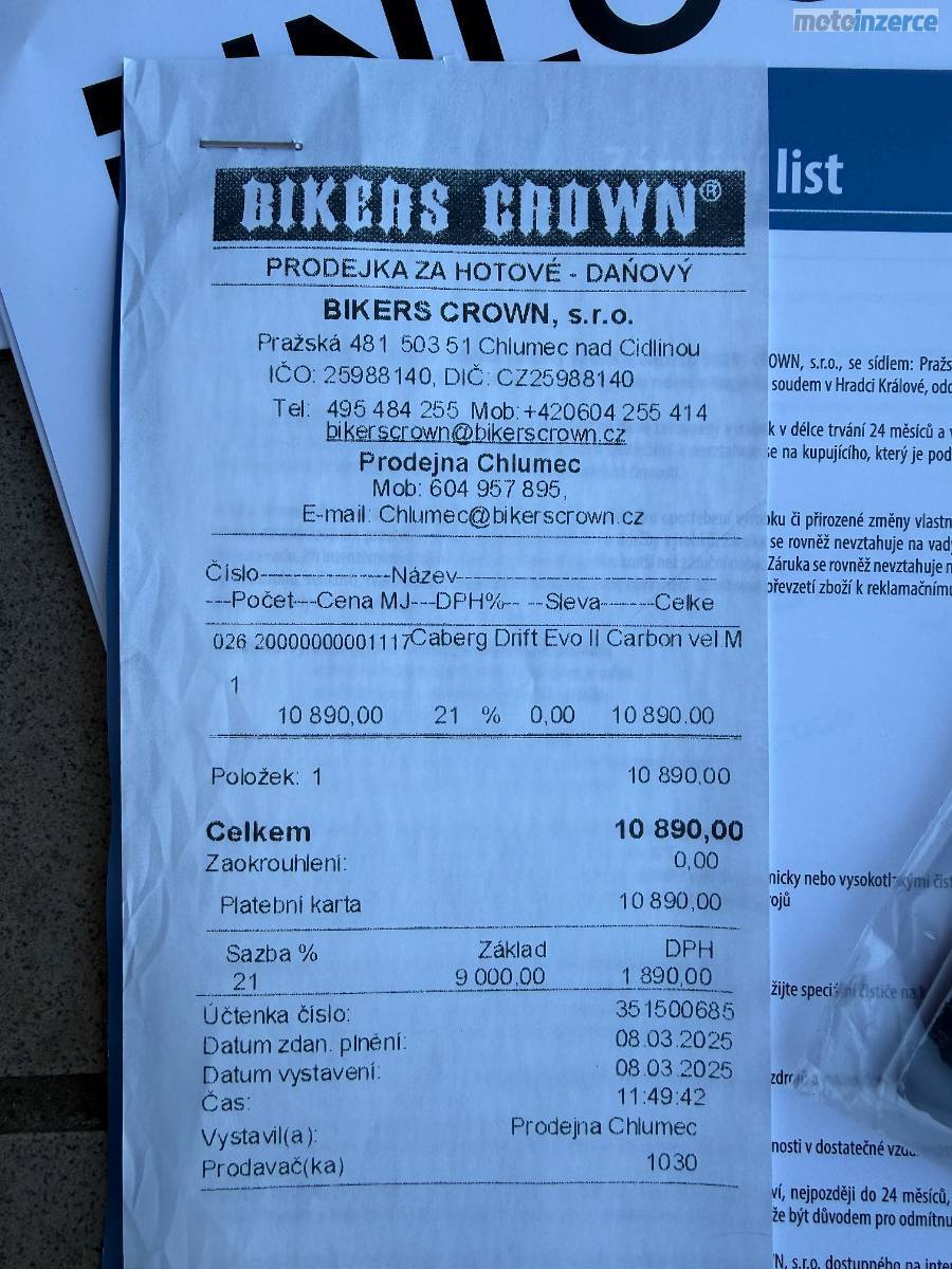 Prodám nádhernou helmu Caberg DRIFT EVO II CARBON velikost M. Helmu jsem zakoupil 8.3.2025 v BikersCrown v Chlumci nad Cidlinou. Helma byla za částku 10 890 kč. Helma má sluneční clonu. Dokoupil jsem i kouřové plexisklo. Jak čiré tak kouřové mají PINLOCK. V helmě jsem toho moc nenajel proto že jsem přešel na cestovní moto a enduro helmu. Helma je ve stavu nové. Jel jsem v ní pouze s kuklou. Cena 7 000 kč.