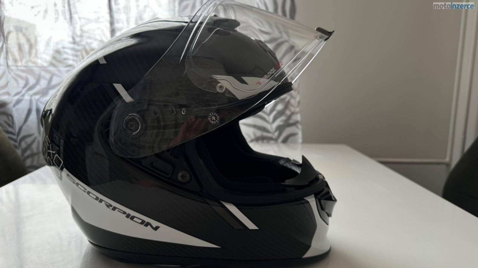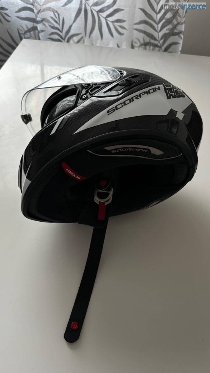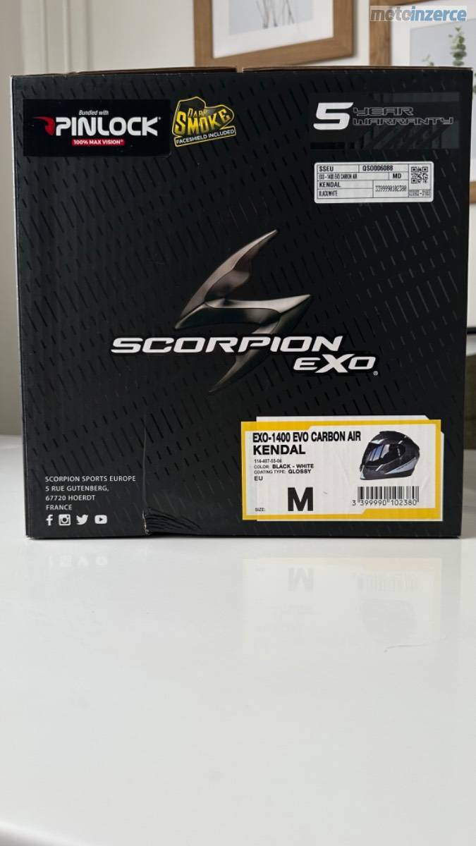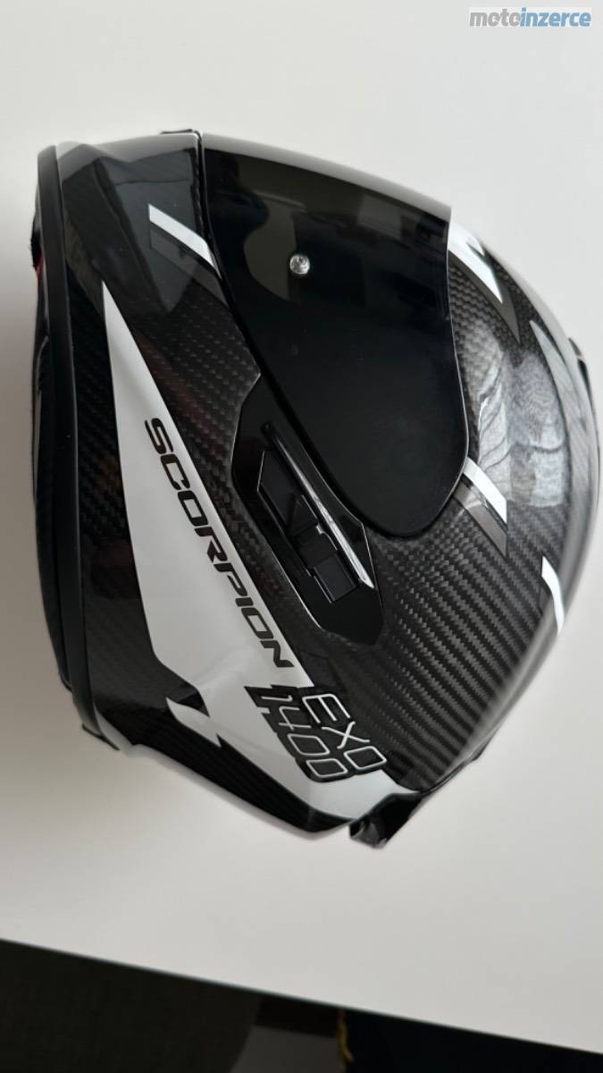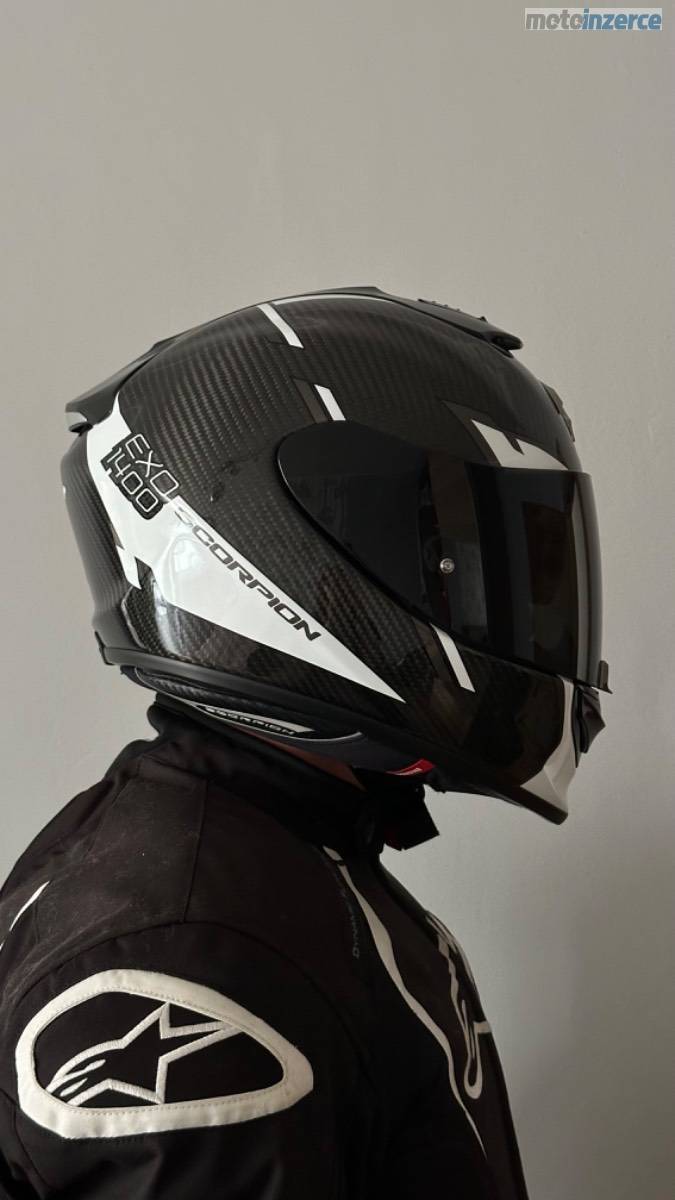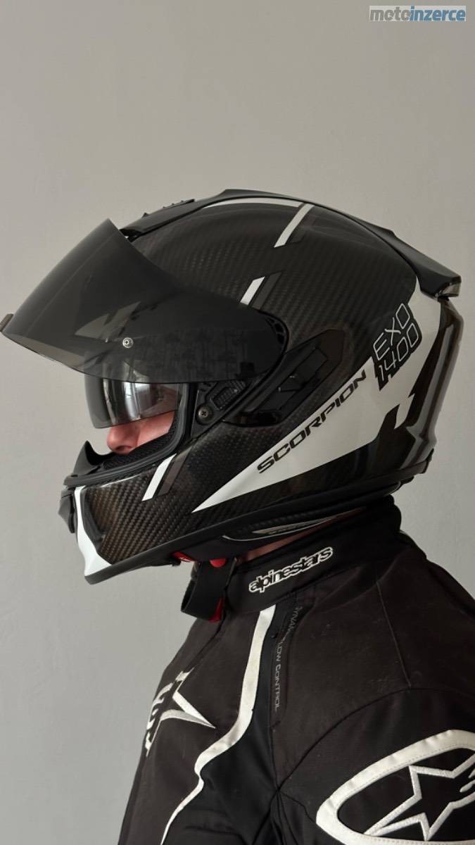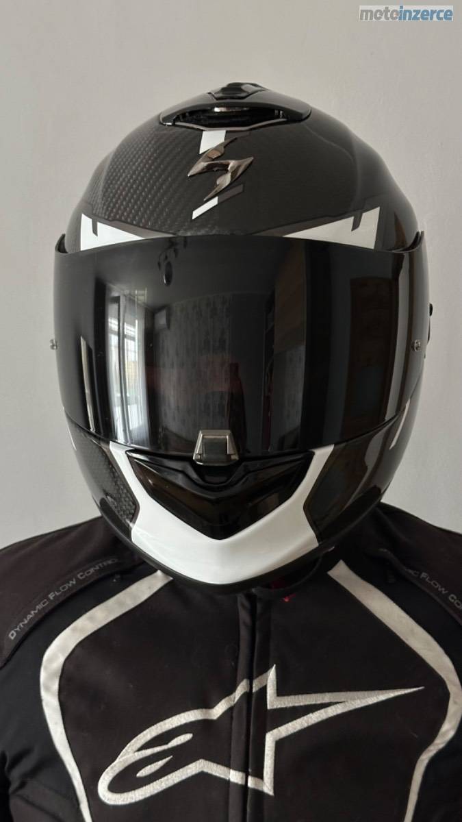 Karbonová přilba Scorpion EXO-1400 EVO Carbon Air Kendal, černo-bílá, lesklá, velikost M. Váha pouhých cca 1350–1400 g. K přilbě jsou dvě sklíčka: jedno čiré s Pinlockem proti mlžení a druhé tmavé. Integrovaná sluneční clona. Minimálně použitá, ideální kombinace lehkosti, bezpečí a komfortu.