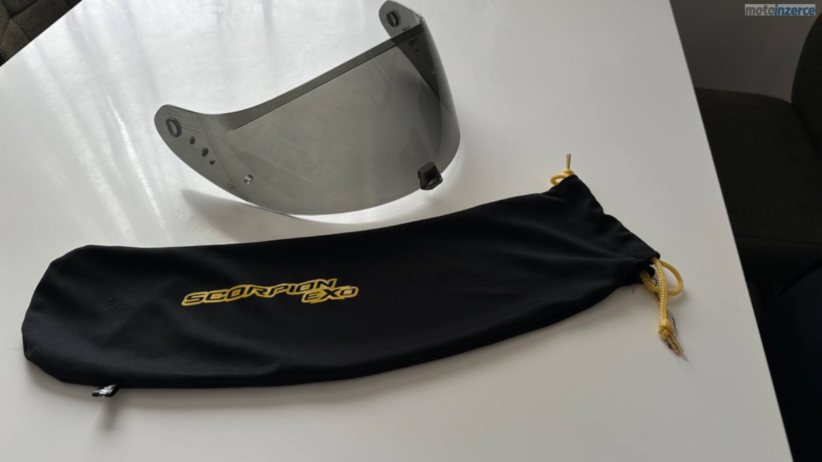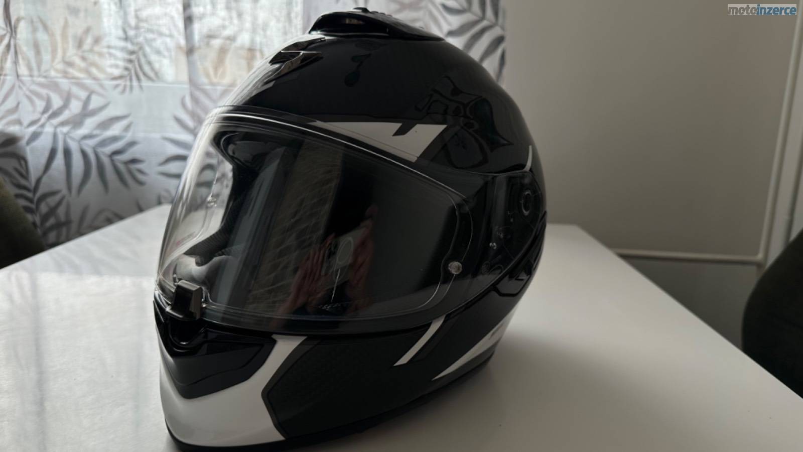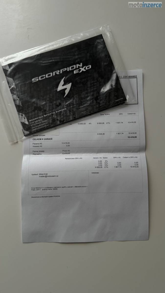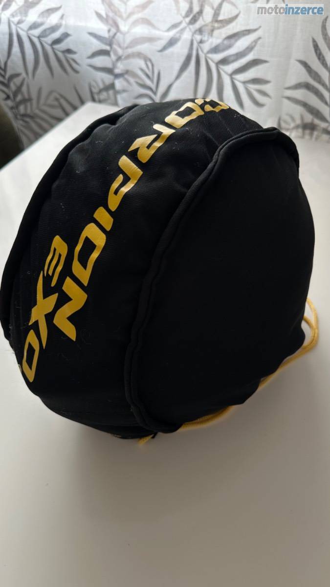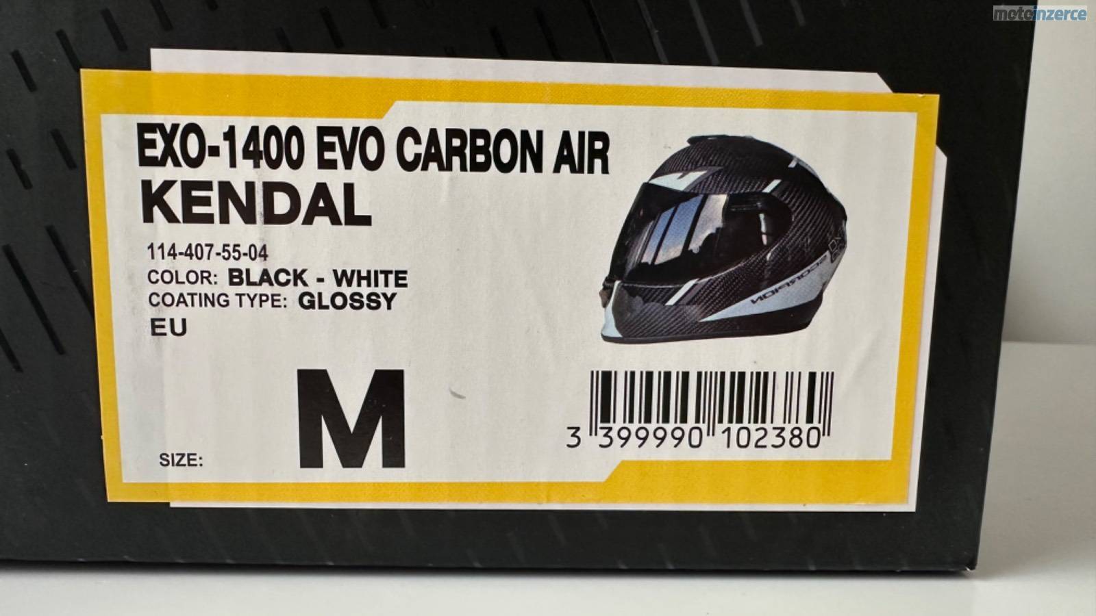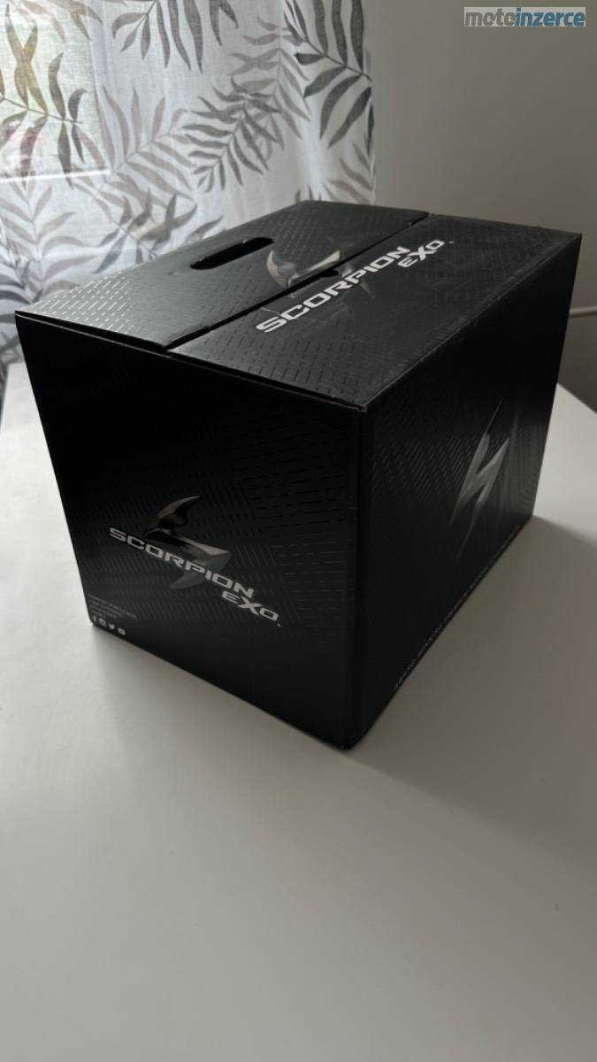 Karbonová přilba Scorpion EXO-1400 EVO Carbon Air Kendal, černo-bílá, lesklá, velikost M. Váha pouhých cca 1350–1400 g. K přilbě jsou dvě sklíčka: jedno čiré s Pinlockem proti mlžení a druhé tmavé. Integrovaná sluneční clona. Minimálně použitá, ideální kombinace lehkosti, bezpečí a komfortu.
