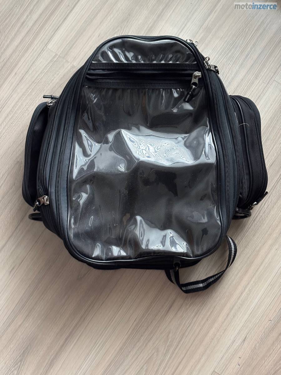 Brašna určená k upevnění na nádrž motorky, obsahuje magnety k uchycení včetně možnosti uchycení na přezku, má více kapes, možnost zvětšení objemu a průhlednou kapsu na mapu/telefon.